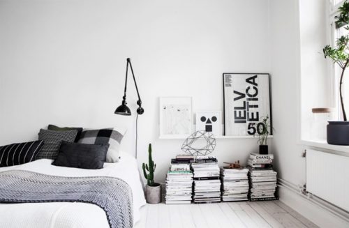Trong mẫu thiết kế phòng ngủ tối giản này, nếu bạn không muốn dọn dẹp những thứ vô ích, bạn có thể sử dụng chúng như là những thứ hữu ích. Ví dụ, đủ các loại tạp chí cũ được xếp ngay ngắn thành một cái bàn để trang trí căn phòng.