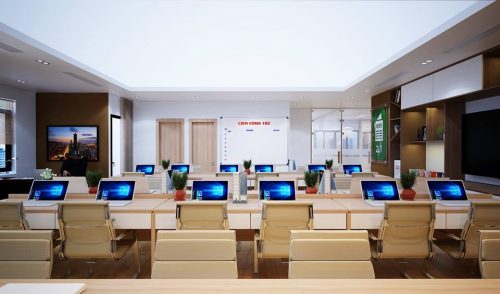 Phòng làm việc của nhân viên với 2 dãy bàn phía ngoài và 1 dãy bàn sát tường. Vị trí trưởng phòng có thể bao quát toàn bộ hoạt động của nhân viên