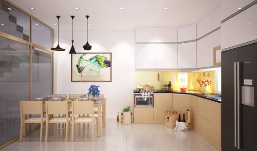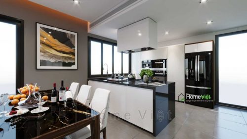 5. Tủ bếp đơn giản kiểu thẳng, liên thông không gian bếp và phòng khách.