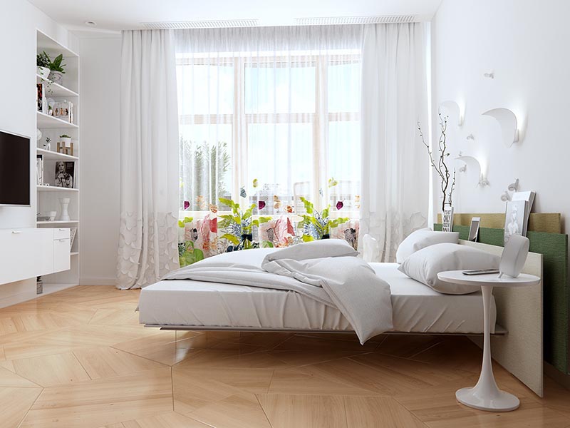 Không gian phòng ngủ vợ chồng được thiết kế nội thất đẹp mắt với gam màu trắng thanh thoát.